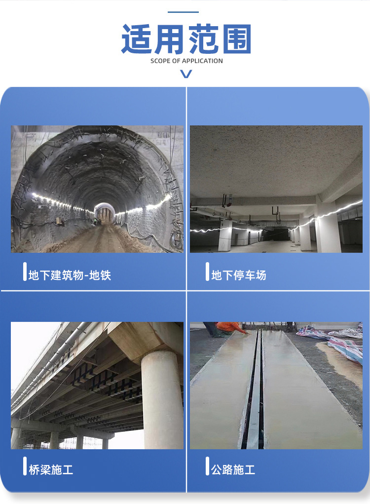 全能型应用:既适用于薄壁结构、大面积浇筑(抗早期开裂),也适用于大体积混凝土、防水工程(补偿收缩 + 抗渗),还可替代防裂金属丝网降低成本 |